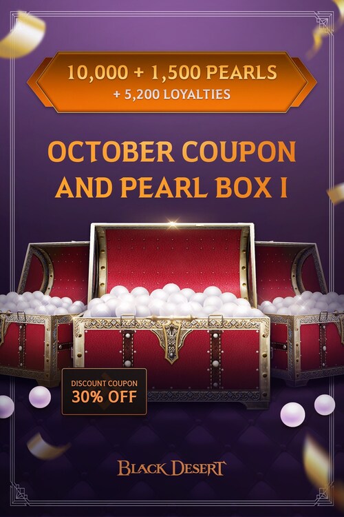 October Coupon and Pearl Box I includes the following: [30% DC Coupon Included] Pearl Box - 10,000+1,500 Contains: - Pearl Box - 10,000+1,500 - 5,200 Loyalties - 30% Discount Coupon x1