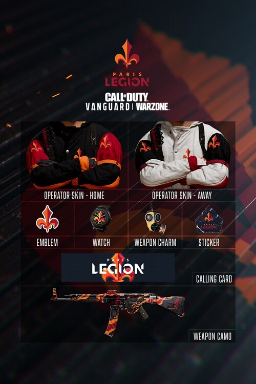 Show your support for Paris Legion in Season 2 of the Call of Duty League™! The 2022 Pack includes a Home and Away uniform for use on all 12 base Operators, a streetwear inspired weapon camo, watch, a gas mask themed weapon charm, sticker, calling card and emblem.