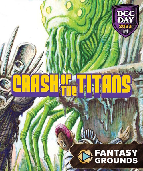 DCC Day #4: Crash of the Titans is a 3rd level adventure that pits the players' brains against the titanic brawn of two giant mutants. The adventure includes a full color map and cardboard standees to track the gargantuan monstrosities as they move through the city, blocking the party's progress or -- even worse -- mashing them to paste under their towering bulks!