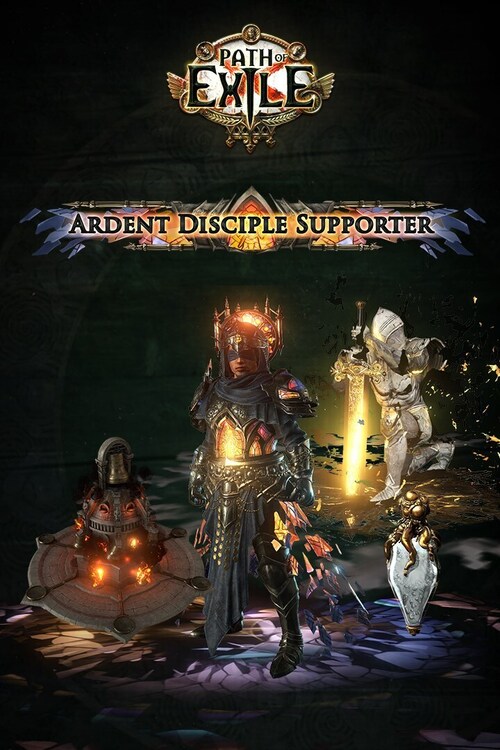 The Ardent Disciple Supporter Pack contains an Armour Set, a Flask Skin, an Added Weapon Effect, a Hideout Decoration, two Social Frames, two Forum Titles, two Badges, and 600 points.