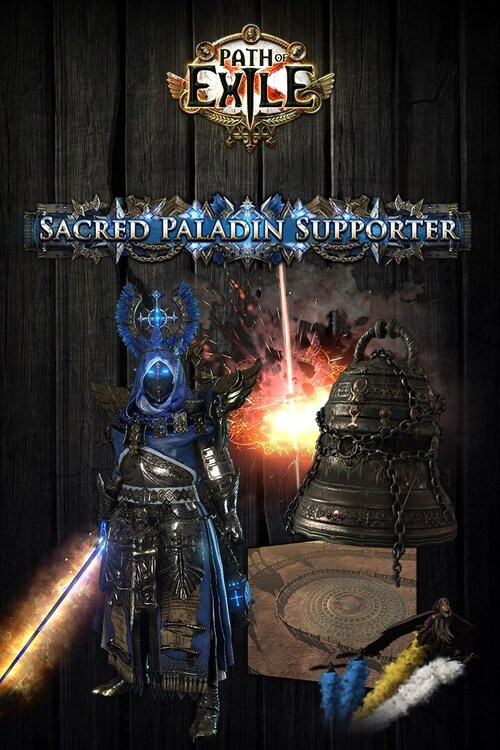 The Sacred Paladin Supporter Pack contains a Back Attachment, a Hideout, an Armour Set, a Finisher Effect, a Weapon Effect, a Level-up Effect, three Social Frames, three Forum Titles, three Badges, and 900 points.