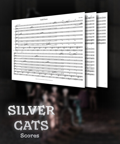 The set contains sheet music from the Silver Cats soundtracks: orchestral scores in A3 format and separately sheet music for each instrument in A4 format. The set also includes sheet music for the Magic Piano soundtracks.