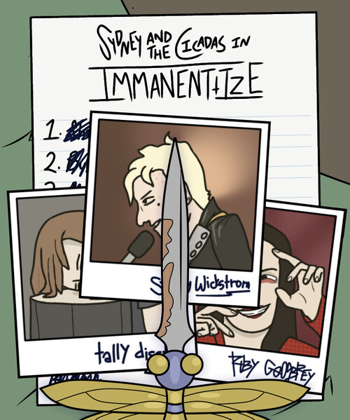 Sydney and the Cicadas were a punk rock band from Vermont in the early 1990's, consisting of friends and lovers Sydney Wickstrom (lead guitarist/vocalist), Ruby Goodbrey (bassist), and Natalia 'Tally' Disston (drummer). They largely performed as a cover band until the summer of 1992, when they went on an excursion to an abandoned citadel to explore an original album. Only Sydney returned, finishing the band's first and only album Immanentize on September 21, 1993, with the help of Ruby's brother, Reuben.